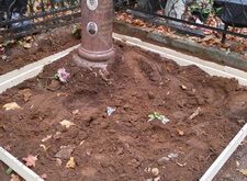 Устанавливаем новый гранитный цоколь. Гранит был выбран красного оттенка (лезниковский сорт гранита), так как хотелось, чтобы последние памятники, цоколь и новые памятники были в одном стиле.