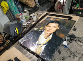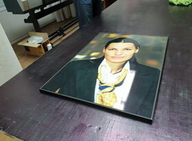 Затем из металлического профиля мы изготавливаем рамку, тыльную сторону которой закрывает прямоугольный белый фон. Распечатанный на плёнке портрет мы приклеиваем к вспененной основе для придания необходимого объёма и жесткости.