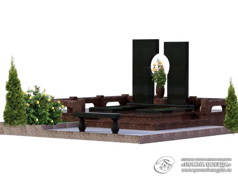 Двойной мемориальный комплекс. Классические формы. Максимальное покрытие участка гранитом. Здесь есть все необходимые элементы: надгробные плиты, цветники, ваза, лавочка, ограда. Хорошо сочетаются два сорта гранита – красный и черный. Данный комплекс использует хорошее решение для выделения значимости центральной зоны – поднятие уровня. Очень сильный ход, используется часто, не всегда осознается. Работает безотказно.