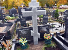 Изначально на месте захоронения находился лишь широкий горизонтальный памятник из чёрного гранита, разделённый на две половины светлым православным крестом. Клиент пожелал выгравировать на пустом пространстве памятник новую надпись, так как на могиле недавно произошло дозахоронение.