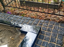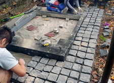 Приступаем к созданию наземного покрытия. По просьбе клиента в центре участка будет находиться широкий цветник, остальную же территорию предполагается замостить гранитной брусчаткой. Засыпаем геотекстиль пескобетонной смесью и укладываем брусчатку, параллельно монтируя цветник из гранитных балок.