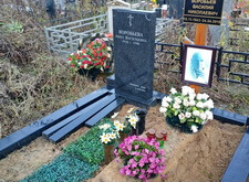 На данном участке был проведён сравнительно большой объём работ. Первым делом были убраны сорные растения и сухостой, заполонившие место захоронения. После этого мы помыли и протёрли весь гранит. Далее установили по центру участка вазы, наполнили их водой и поместили внутрь свежие цветы. Для удобства оценки качества проведённой работы мы сфотографировали убранное место захоронения с разных ракурсов.